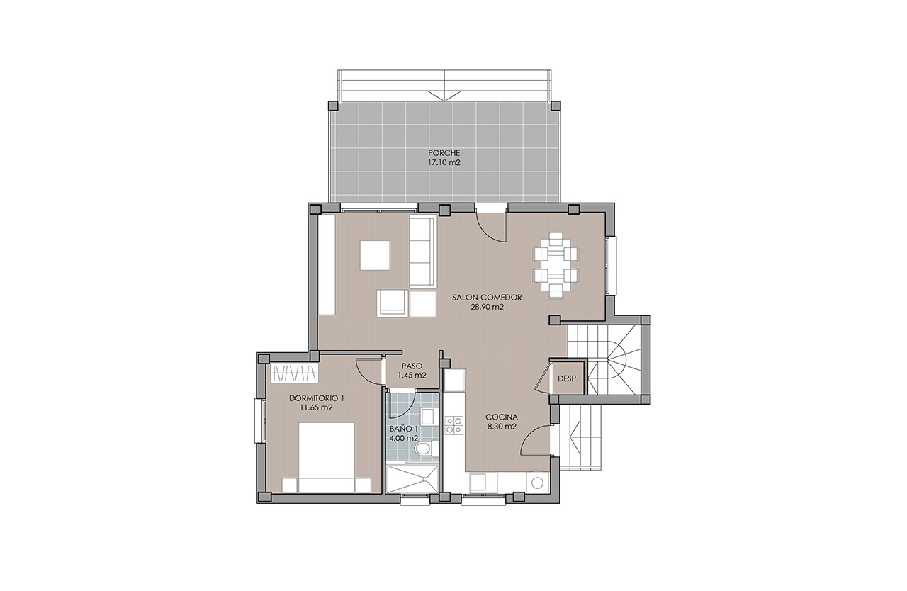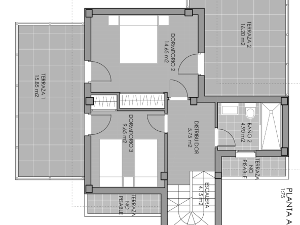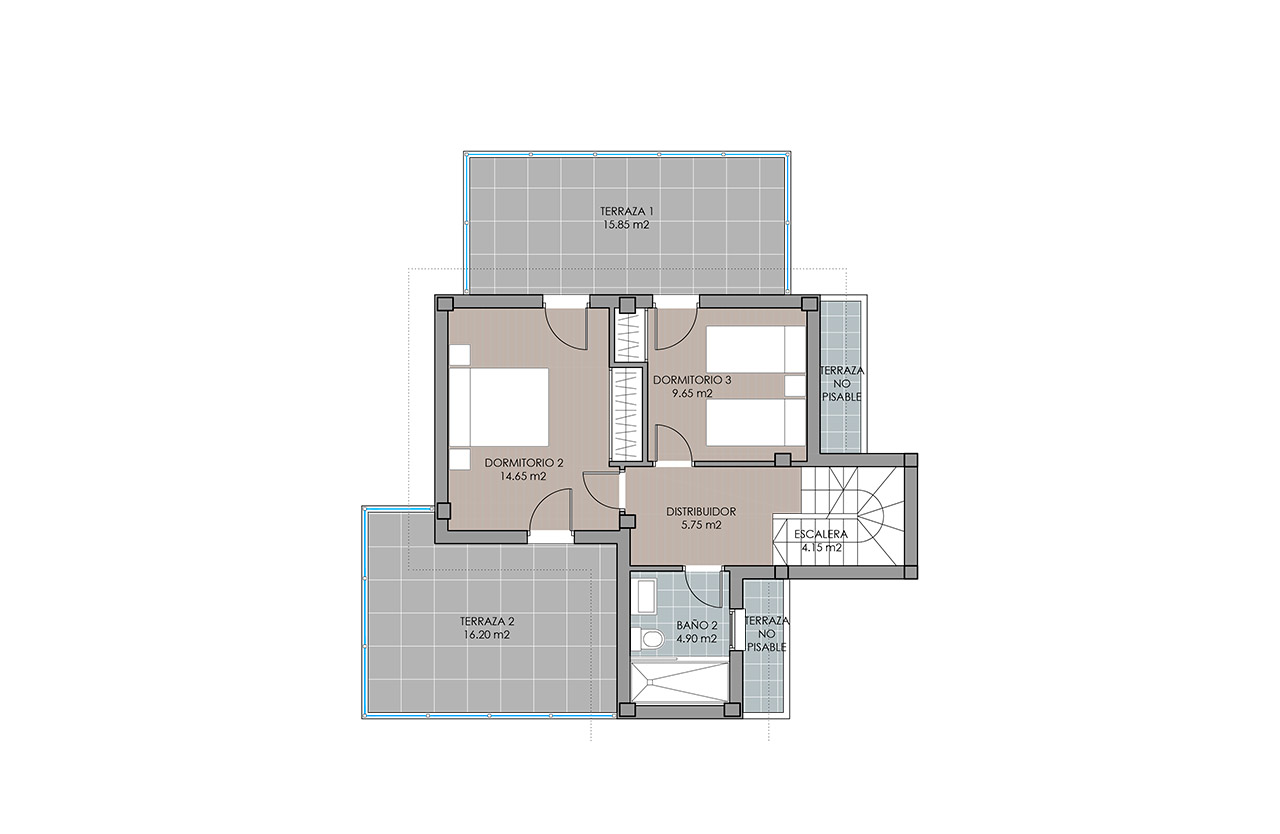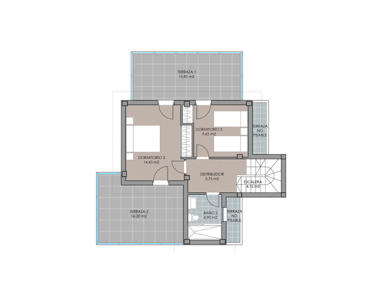 On the second floor you will find the rest area. The two spacious rooms are perfect for your children. They are very well distributed, so that you can take advantage of all the space, and have their own terrace, so they will enjoy the warm light of the Mediterranean all year round. The master suite is beautiful, very spacious, with a large bathroom and a private terrace that will be your refuge from the first day.
