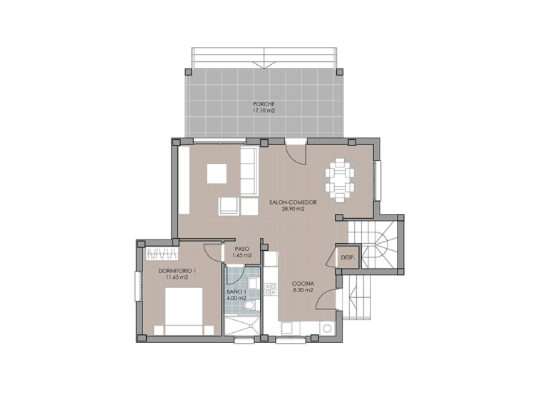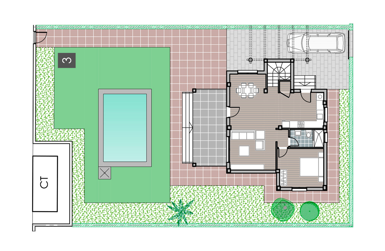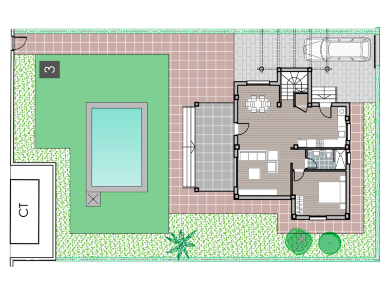 Natura Pinet villas are located on large plots of almost 500sqm, distributed in three heights. They have 3 bedrooms, 2 bathrooms and 1 toilet, in addition to large terraces, garden, solarium and private swimming pool.