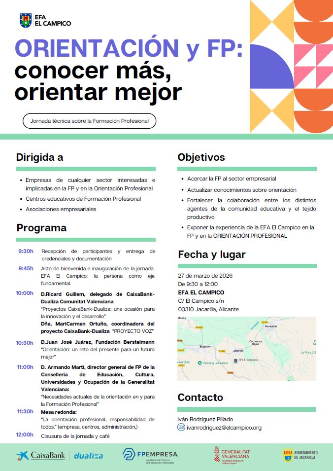 MPC Group será una de las empresas patrocinadoras principales de la jornada técnica sobre Formación Profesional titulada ‘Orientación y FP: conocer más, orientar mejor’, un encuentro que se celebrará el próximo 27 de marzo en las instalaciones de EFA El Campico, en Jacarilla (Alicante). La iniciativa reunirá a representantes del ámbito educativo, empresarial e institucional con el objetivo de analizar el papel de la orientación profesional y su conexión con las necesidades reales del mercado laboral.