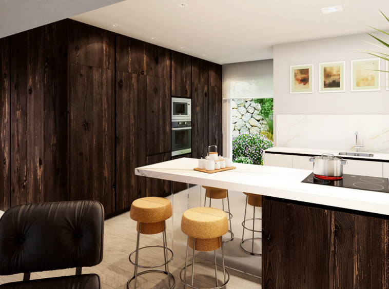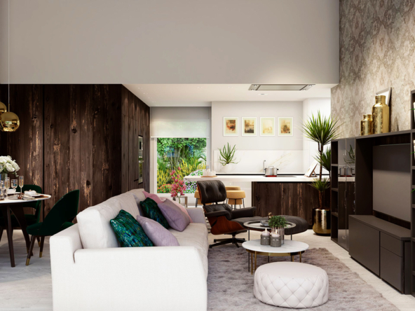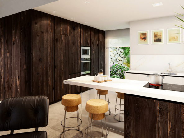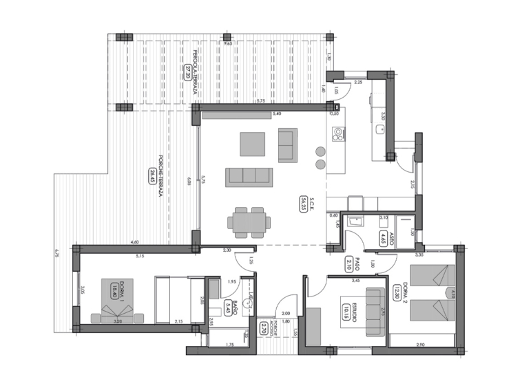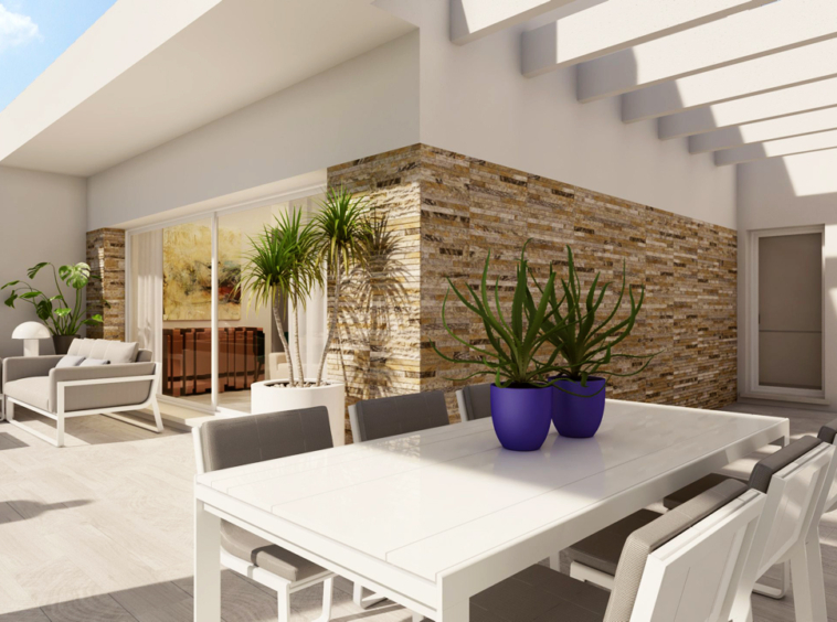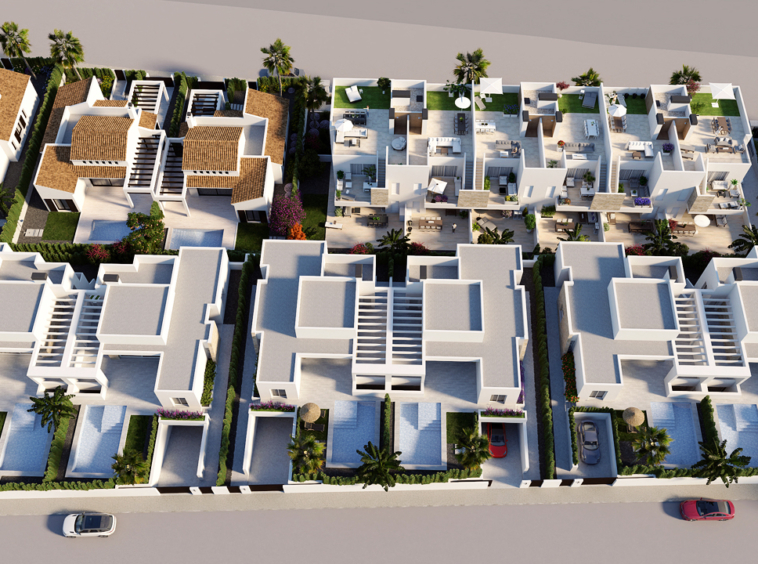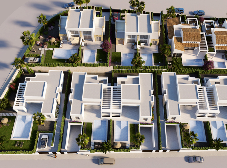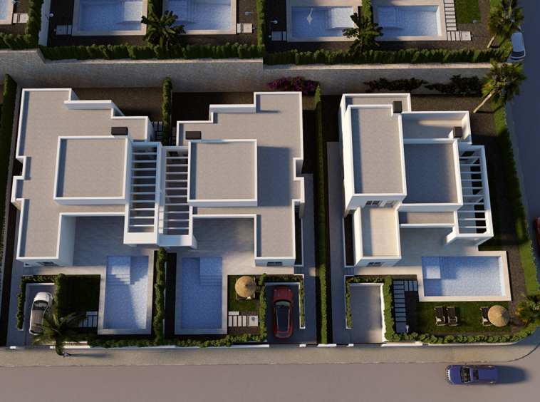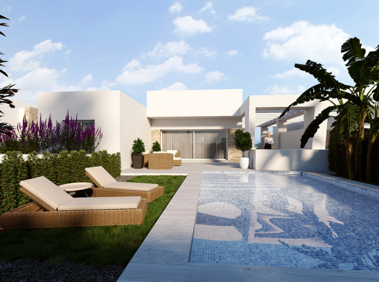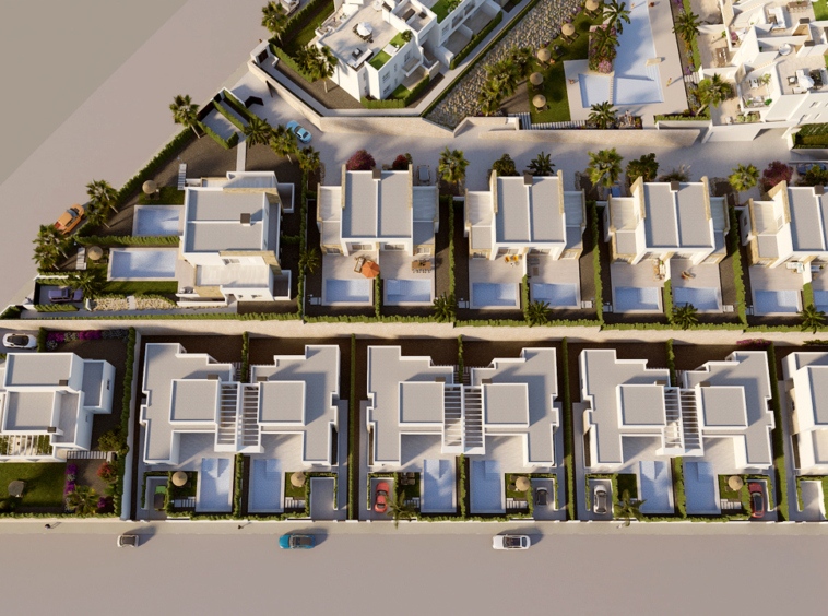 Las viviendas Andros disponen 3 dormitorios y 2 baños distribuidas en una sola planta. La zona de día la componen la cocina y el salón unidos en un solo espacio diáfano y cómodo que se abre y se funde por completo con la terraza y la piscina privada, disfrutando con ello de unas maravillosas vistas en nuestro día a día.