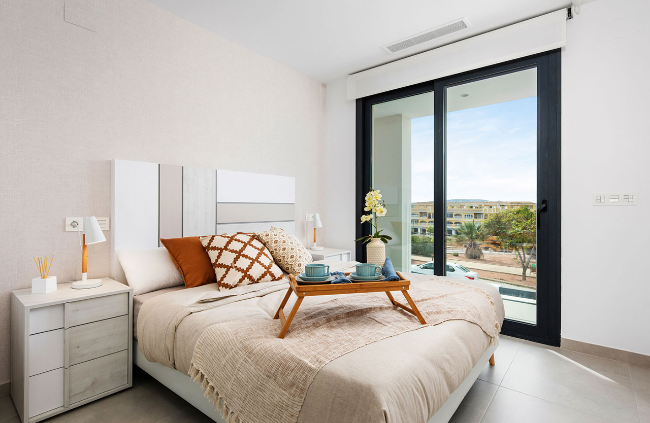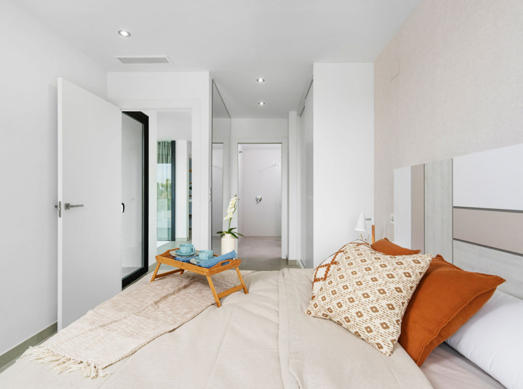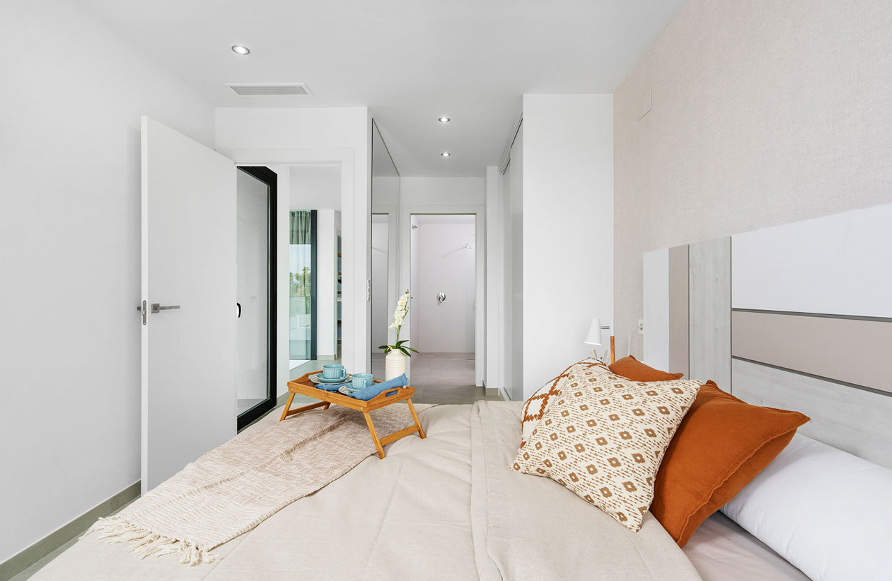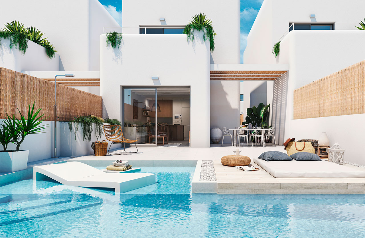 Villas independientes de 3 dormitorios con 2 o 3 baños, pudiendo elegir entre dos modelos diferentes, Mykonos distribuida en 2 alturas o Santorini, en una sola planta. Ambas tipologías han sido diseñadas para optimizar al máximo el espacio disponible, contando con armarios empotrados con bandeja, cajonera y barra en todas las habitaciones.